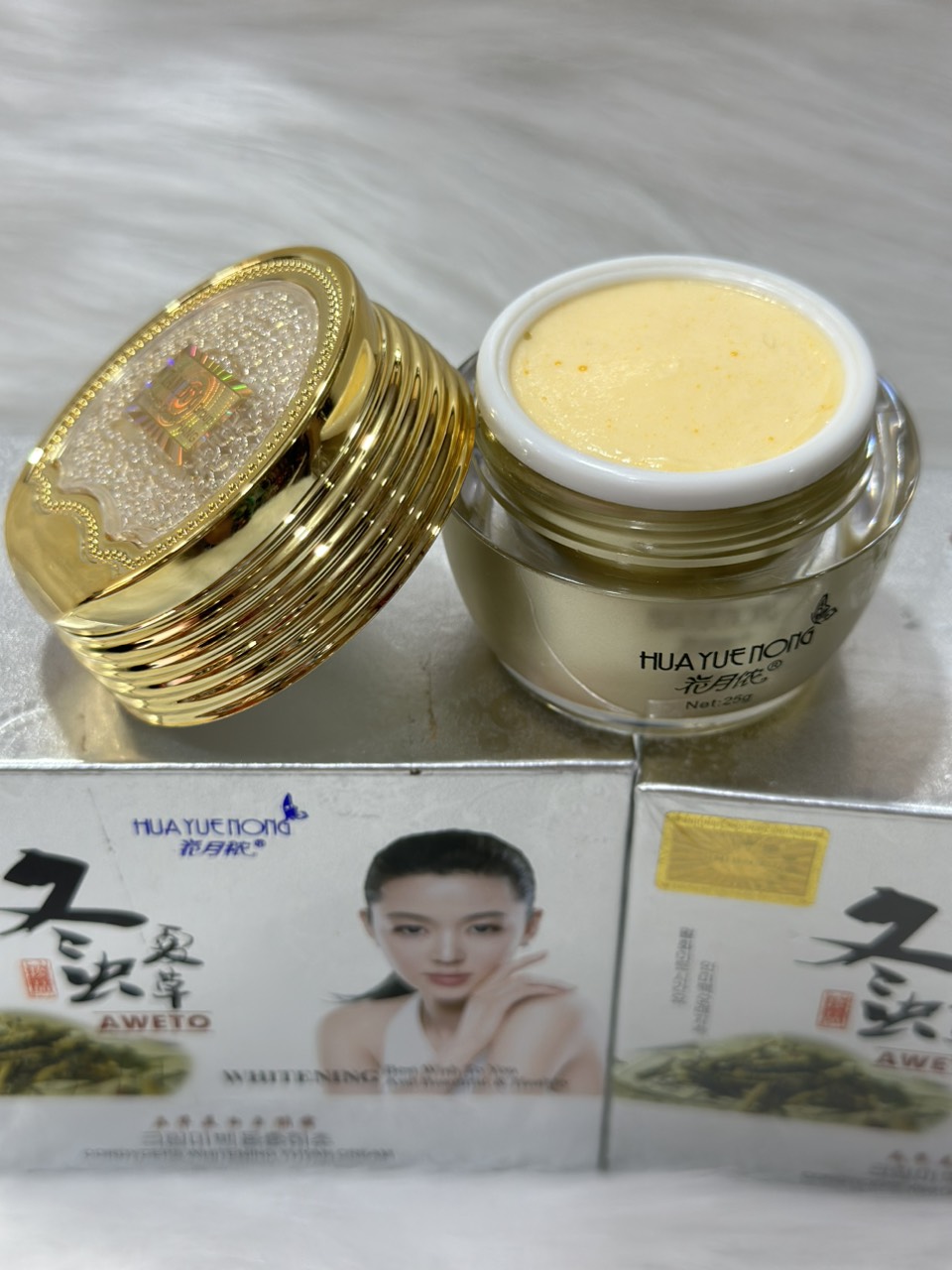Sản phẩm được giới thiệu với các phiên bản khác nhau như “Kem ngọc trai trắng da mờ nám Huayuenong”, “Kem tổ yến dưỡng trắng Huayuenong”, “Kem Huayuenong hoa anh đào whitening cream”… mỗi phiên bản có thêm điểm nhấn thành phần riêng nhưng chung mục tiêu: giúp da trắng sáng, phục hồi và khỏe mạnh hơn.